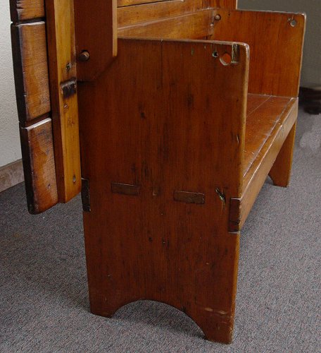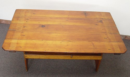 EARLY CHERRY TILT CHAIR TABLE BENCH: Rectangular flip table converts to bench. Thru tenon construction, pegs keep table in place. 46 3/4''high in bench position x 55 1/2'' wide x 15 1/4'' deep. Tabletop measures 55 1/2'' x 34''.