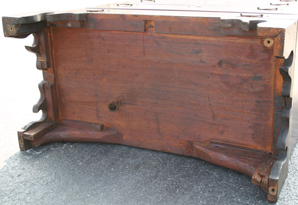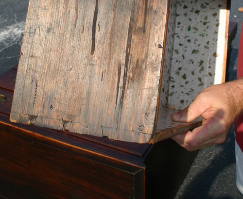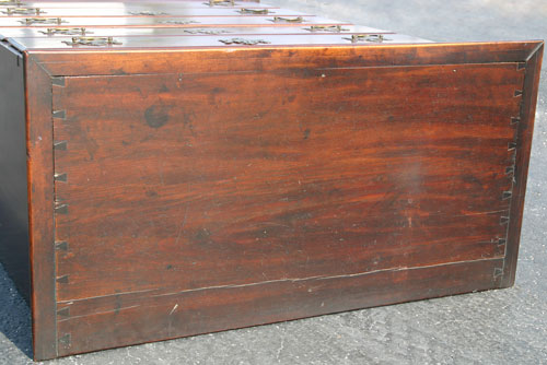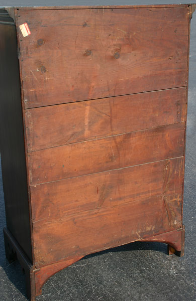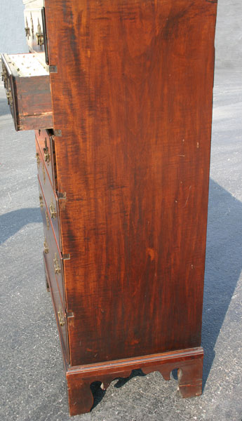 CHIPPENDALE TALL CHEST OF DRAWERS: Tall flat top chest with molded overhanging top, 6 full length drawers. Bracket feet, shaped skirt. The three drawer with escutcheons have had the locks removed. One lock plate and pulls are included from the estate. 56''h. x 39'' x 20''. Sold with hand written family provenance stating this chest was brought from Uxbridge Massachusetts in the same wagon as Susanna Aldrich, 1804-1865.