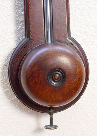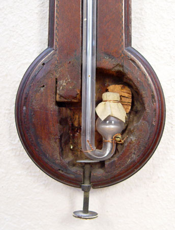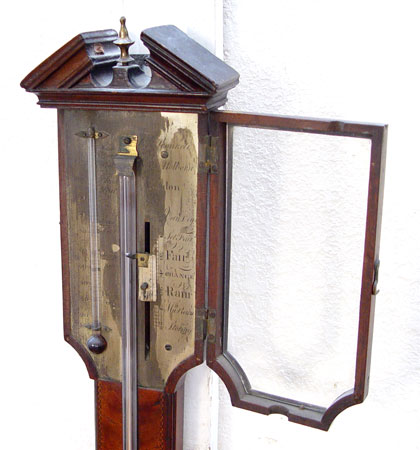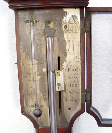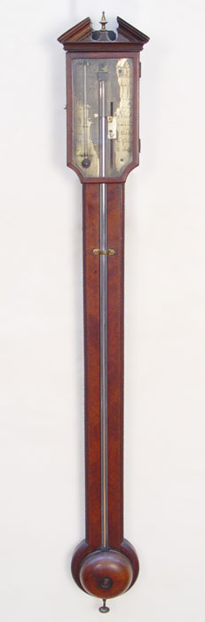 GEORGIAN RONKETTI LONDON STICK BAROMETER: Circa 1787-1797. Wood case and body with stringing inlay down body. Original cistern cover. Glass front cabinet. Some loss to silver on silvered register plate. Engraved on plate J.M. Ronketi (Ronketti), No. 180 Holborn London. Glass tubes are perfect. Measures 39'' high x 4 1/4'' wide x 1 1/2'' deep. Please note small crack in case door.
