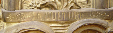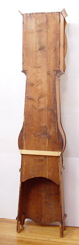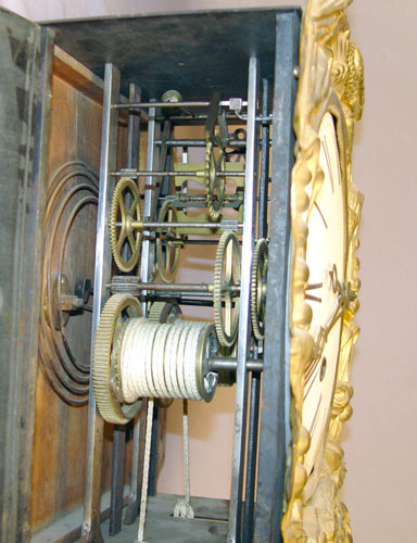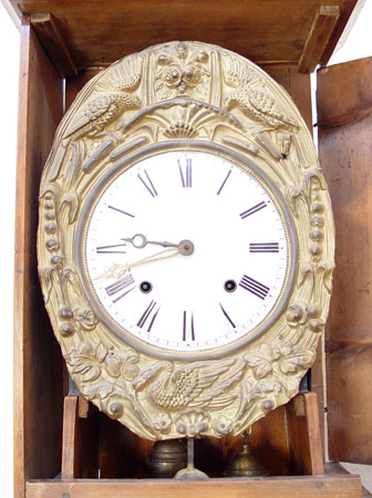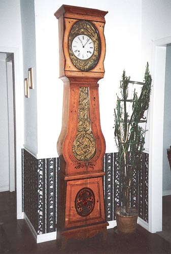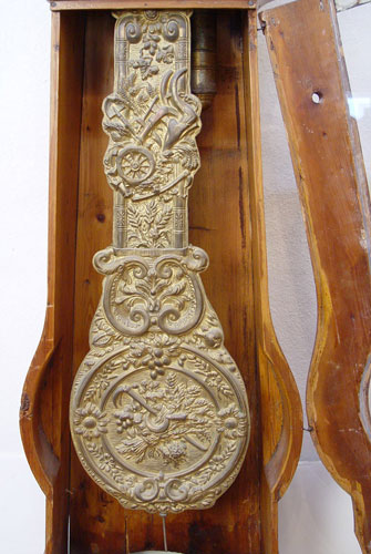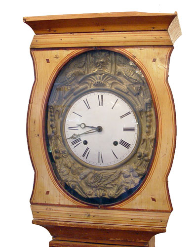EARLY LA CULTURE GRANDFATHER WAG CLOCK: Hand painted country style wood case with wag clock. Roman numerals on 10'' face with surrounding metal having birds, floral and crops relief decoration. Large metal pendulum relief decorated with sickles, cart, crops and floral decoration. Marked on pendulum La Culture. Measures 93'' high x 20'' wide x 9 1/2'' deep. Please call for condition.