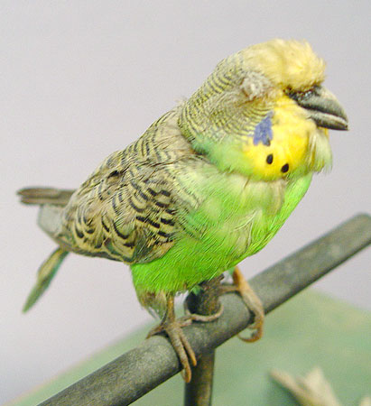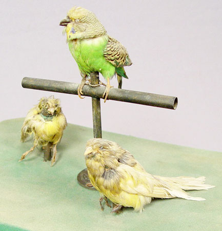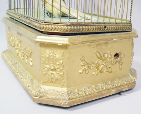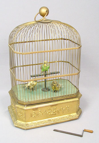 LARGE VICTORIAN 3 SINGING BIRD AUTOMATON: 3 taxidermy birds, parakeet and two canaries, in ornate brass cage. The base is gesso and wood. In working order though a bit sluggish. Please call for condition. 23'' x 15'' x 10''
