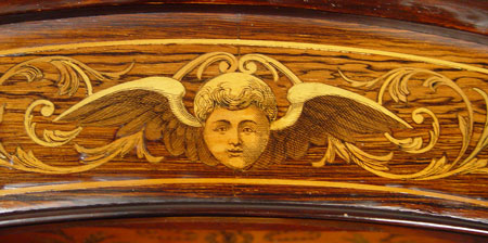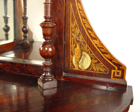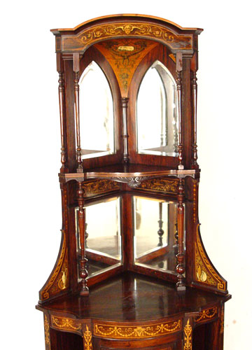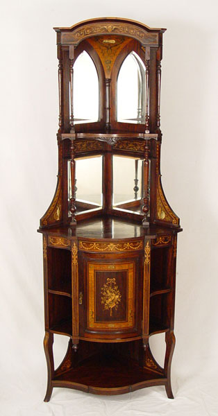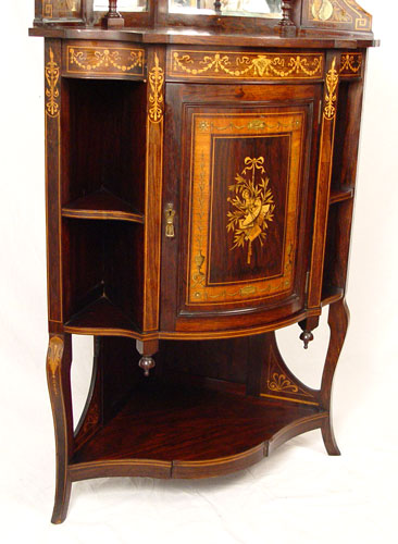 FABULOUS VICTORIAN ROSEWOOD PICTORIAL IVORY INLAID ETAGERE: Finest example of ivory and wood inlays. Two open tiers backed with bevel mirrors, lower section with bow front door flanked by shaped open shelves and over a full open shelf. 82'' high x 30'' across front x 21'' deep.