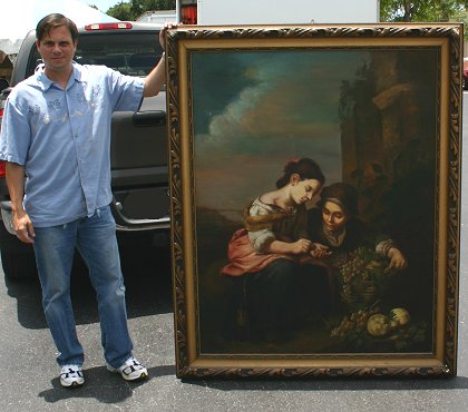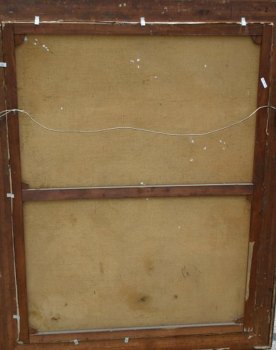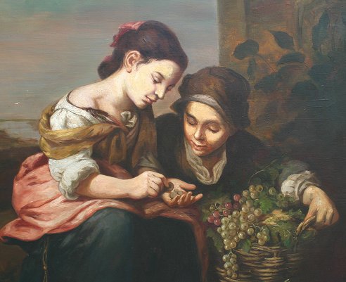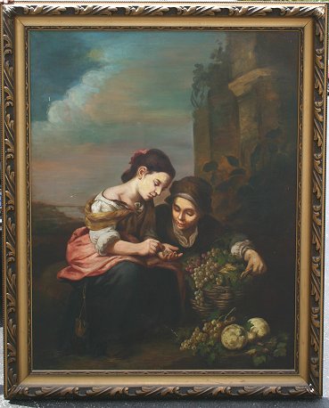 LARGE UNSIGNED OLD MASTER STYLE 19TH C OIL/CANVAS PAINTING: Depicts produce seller with young maiden buying grapes, 57'' x 44'', period frame with missing gesso on several corners, in need of repair, 66'' x 53''. Needs cleaning, several abrasions with minor paint loss, scattered areas of patchwork visible verso.