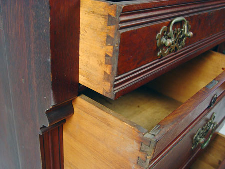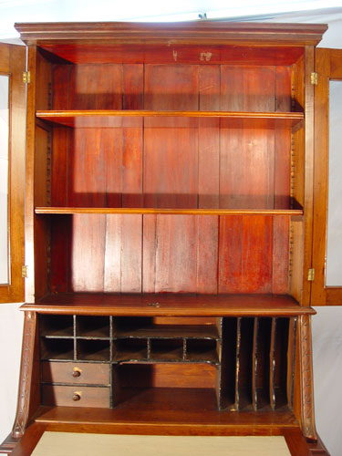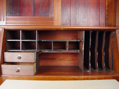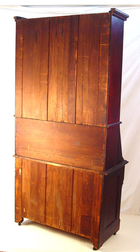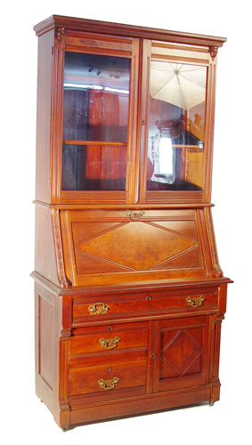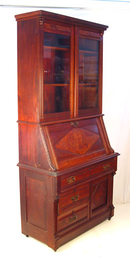 VICTORIAN WALNUT SECRETARY BOOKCASE: Bookcase over slant front desk. Full length drawer over half length drawers and door. Handsome, clean line period Victorian. 83'' high x 40 1/2'' wide x 19 3/4'' deep.