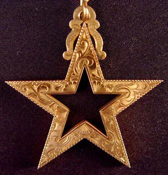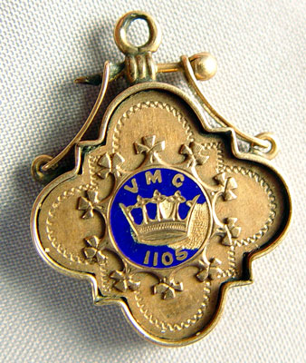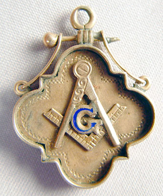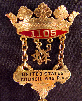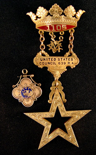 14K MASONIC ROYAL ARCANUM U. S. COUNCIL PIN & PENDANT: 14K yellow gold Royal Arcanum United States Council pin. Top piece is a crown with red guilloche enamel and number 1105. A stylized piece with initials VCM hang from the center of the crown, mote, missing one connecting ring. Center piece is a scrolled plaque with black enamel lettering ''United States Council 639 R.A.'' Lower piece is a 5 point star with engraved scroll work. The reverse of the star is engraved ''Presented to P.R. Arthur E. Seymour by United States Council 639 R.A. January 8th 1909. Weight: 30.0 grams. Also included is a Masonic pendant with Masonic symbol on front and enamel VMC 1105 with crown on reverse. Unsure of metal content on pendant, chip to enamel on back.