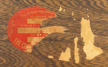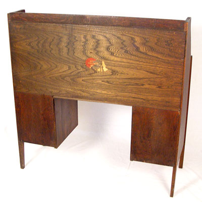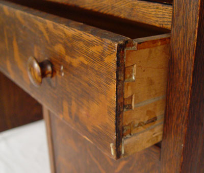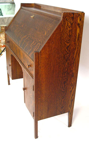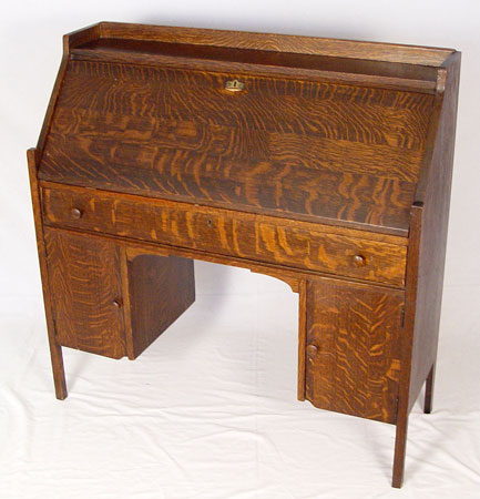 ARTS & CRAFTS TIGER OAK SLANT FRONT DESK: Partial label on back. Interior fitted with drawers and cubicles. Full length drawer under slant front, cabinet doors flank the kneehole. Measures 42'' high x 41 1/2'' wide x 15 1/2'' deep.