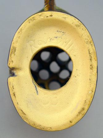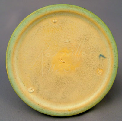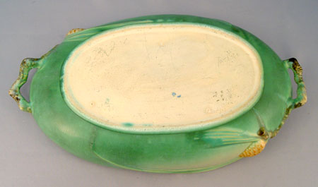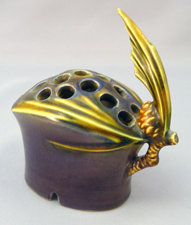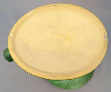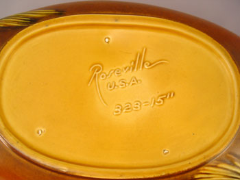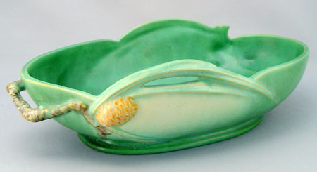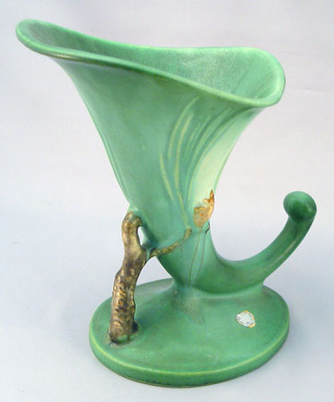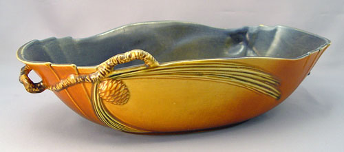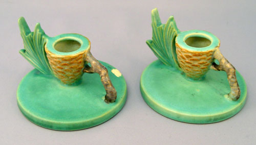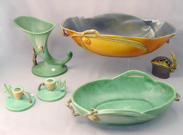 6 PIECE ROSEVILLE POTTERY IN THE PINE CONE PATTERN: To include 1) Green cornucopia vase 128-8, 8 1/2'' high. Remnants of foil label. 2) Pair of green candleholders 1223, 2 3/4'' high, please note chip on one. 3) Green center bowl 13 3/4'' wide x 4'' high. 4) Brown flower frog 33, 4 3/4'' high. 5) Brown center bowl 323-15''.