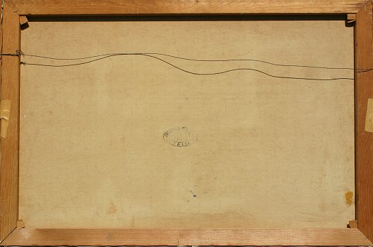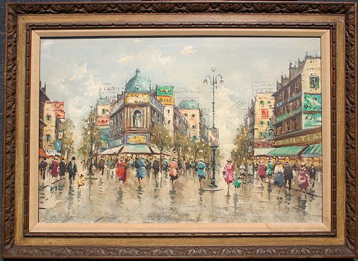 DEVITY STUDIOS PARISIAN STREET SCENE: Oil/Canvas, 24'' x 36'', stencil mark verso, carved frame 32'' x 44''. Patch in lower left margin, several other minor puncture repairs.