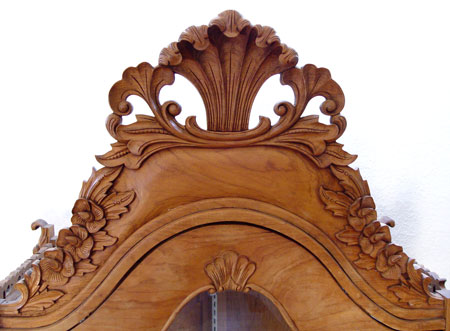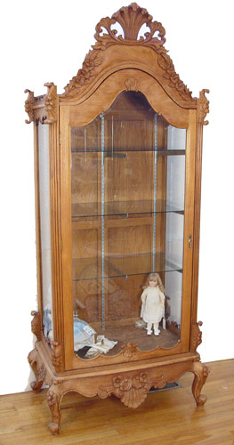 CARVED TEAK FRENCH STYLE CURIO CABINET: Shaped and beveled glass door, glass sides and three adjustable glass shelves. Illuminated interior. Contemporary manufacture. 8'3'' tall x 43'' x 24''.