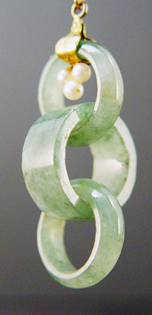 ESTATE FOUND NEPHRITE JADE AND PEARL DROP EARRINGS: Tear shape nephrite framed in pearls. Suspended from the tears is a chain of three links of nephrite. 2 3/8'' long. Stamped 14K, does not assay as such. Clip on backs.