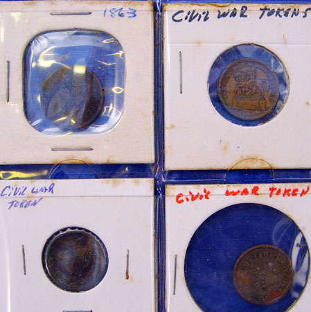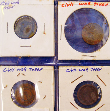 20 NEW YORK CIVIL WAR TOKENS / COINS: 19 Civil War tokens to include Petersons Jewelers 1863, First in War First in peace 1863, Liberty 1864 with die break, John Sacksteder Sewing Machine Mfg, Army & Navy undated, Oliver Boutwell Miller Troy NY, Gustavus Lindenmueller New York, Army Navy 1863, Knickerbocker currency, Union for Ever 1863, For our country A common cause, ?Toas Bros. New York Army Navy, Army Navy undated, Our Navy 1863 (ironside), H. G. Bang Restaurant Broadway Importer of Rhine Wines, United States Copper Tradesman Currency, Peace Forever 1863, For one cent 1863 Indian Head, 1863 Union with 6 pointed star. Most tokens are from New York area. Also included is a Brooklyn Bridge inauguration coin with George Washington on one side, bridge on other.