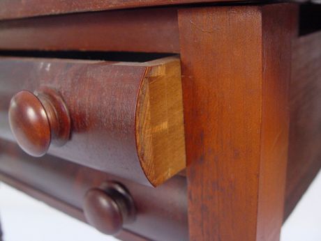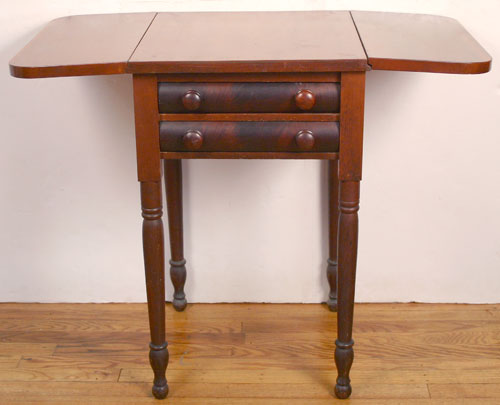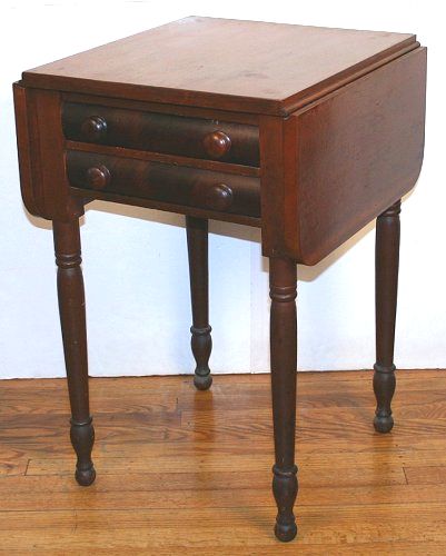19TH CENTURY TWO DRAWER MAHOGANY WORK STAND: Drop leaf sides, turned legs. Measures 28 3/4'' high x 19'' x 20''. Leaves are 9 1/4''.