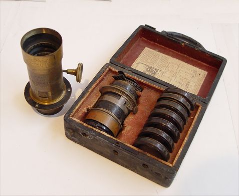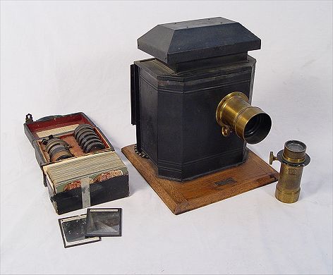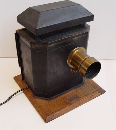 WILLIAMS, BROWN & EARLE REFLECTING LANTERN: Viewer for photographs and stereoviews, sometimes called a magic lamp. Marked Williams, Brown and Earle Philadelphia PA USA Patented Mar. 28 '05 on plaques on base. Comes with Hermages optics and complete case of Darlot's Universal lens set No 2. All optics appear complete and working order. Also comes with 2 glass plates, Paris & Ireland and box of approx. 98 stereoviews. Lamp measures 16'' high x 13'' wide x 15 '' deep to end of optic.