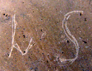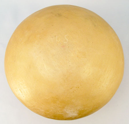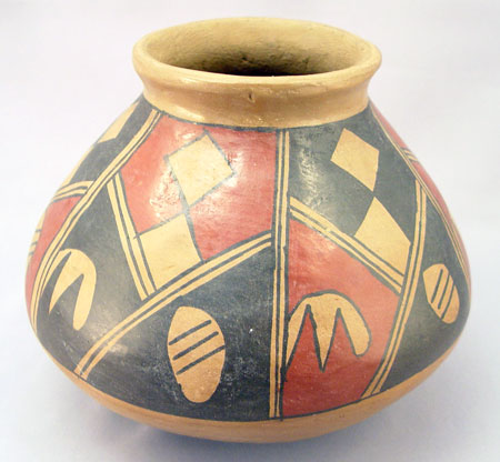 SOUTHWEST NATIVE AMERICAN POTTERY OLLA: Water storage jar. Artist signed LS. Shell tempered, brown-buff slip decorated in hand and diamond motif. Post World War II. 6 1/2''h. 7'' dia. overall.