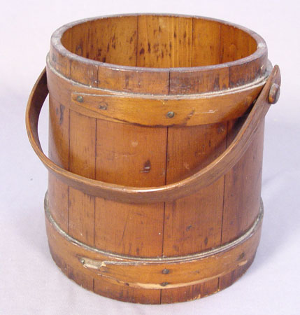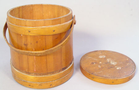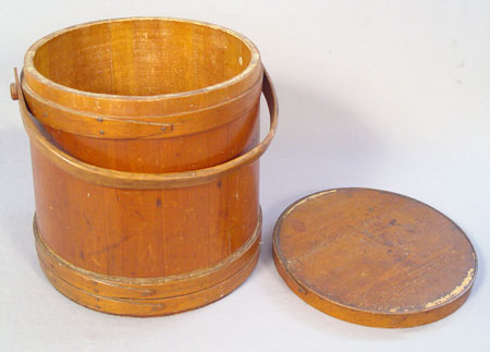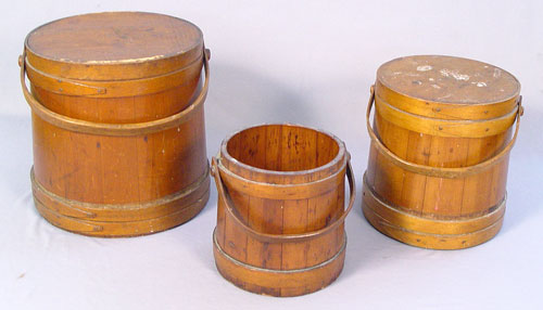 3 1800'S GRADUATED C. WILDER & SONS HINGHAM MASS FIRKINS: Early 19th century set of 3 graduated wood firkins made by C. Wilder & Sons Hingham Mass. Sizes are 9 1/2'' tall x 9 3/4'' base dia, no lid; 11 3/4'' high x 12'' base dia., lid, marked inside base; 14'' high x 15'' base dia., marked on top of lid. All 3 handles intact.