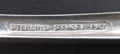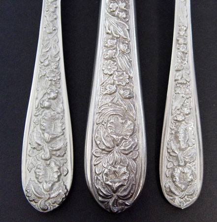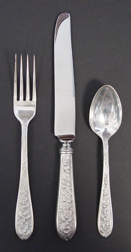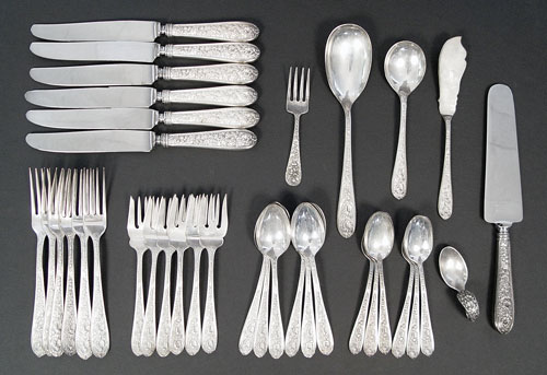 STIEFF ''CORSAGE'' STERLING FLATWARE SERVICE FOR 6: 34 pieces of Corsage design to include 6 dinner forks (7''), 6 salad forks, 6 place knifes (8 3/4''), 6 teaspoons, 6 5 O'clock teaspoons, master butter (7''), cake knife (9 3/4''), serving spoon (8 3/4''), serving spoon (6''). Also included is child's fork and spoon set in the Chrysanthemum design. Approx. 37.7 troy oz.