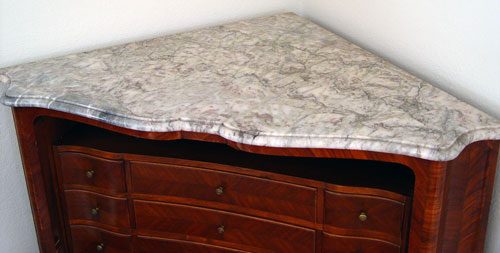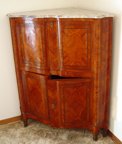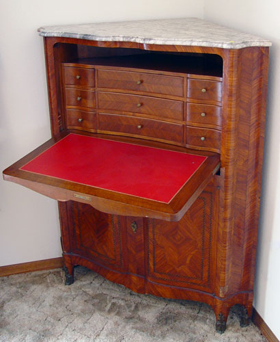 MARBLETOP PARQUETRY INLAY ABATTANT: Serpentine front corner cabinet / desk. Interior fitted with drawers and red leather writing surface. Lower doors hide interior shelf. Minor veneer loss. 52'' high x 42'' across x 27'' deep