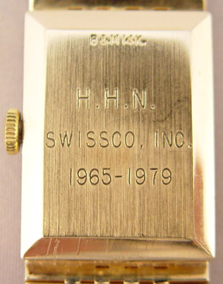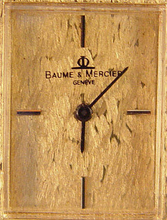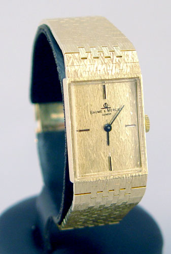 VINTAGE 1970'S BAUM & MERCIER GOLD WRISTWATCH: 14K yellow gold gent's Baum & Mercier wristwatch. Rectangle gold dial with Florentine finish and applied bar markers. Acrylic Crystal. Mechanical jeweled movement. The watch is running. Integrated mesh bracelet with Florentine finish. 7.5'' in length. Weight: 57.0 grams (including movement and crystal). Circa: 1970's Inscription on case. All clocks and watches are sold as is, due to their delicate nature.