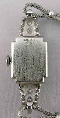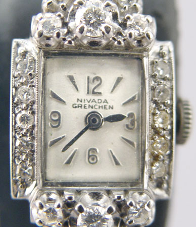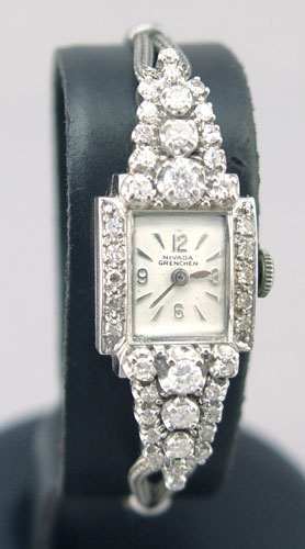 14K 1950'S 1.00 CTW DIAMOND NIVADA GRENCHEN WRISTWATCH: 14K white gold ladies Nivada Grenchen wristwatch. Rectangle silver-tone dial with applied bar and Arabic markers. Glass crystal. Jeweled movement. The watch is running. 38 round single cut diamonds and 2 round full cut diamonds. Approx. 1.00 CTW. Rated VS-SI in clarity and H-I in color. The diamonds are prong set. 10K gold filled mesh cord bracelet with safety chain. Circa: 1950's. All clocks and watches are sold as is, due to their delicate nature.