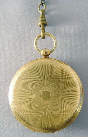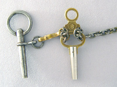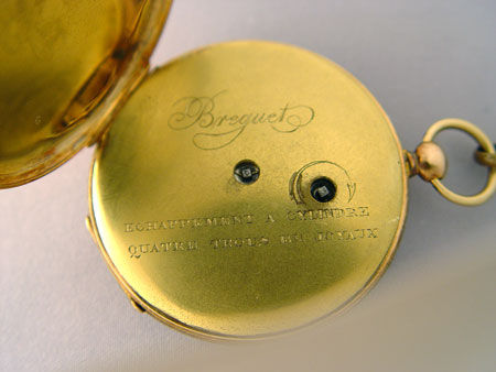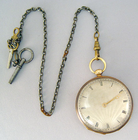 BREGUET OPEN FACED POCKETWATCH: Key wound with two keys and twelve inch watch chain. Metal content unknown. It is running. 1 3/4'' dia and 1/4'' thick.
