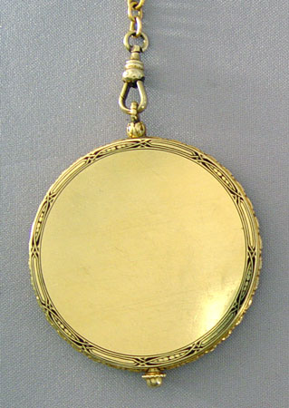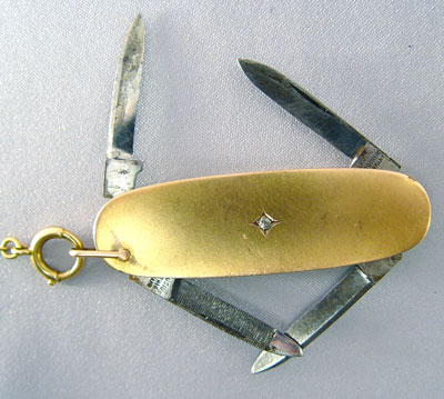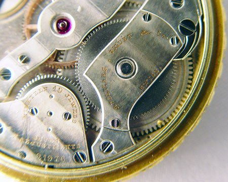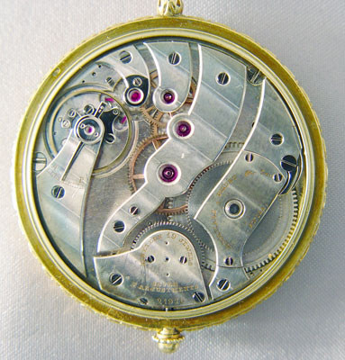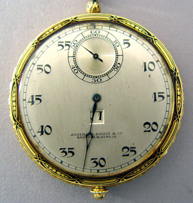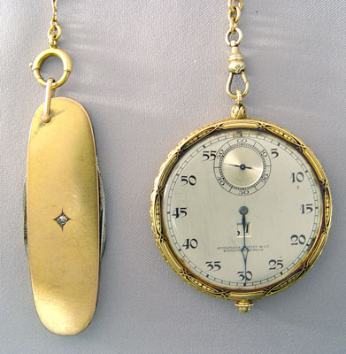 18K AUDEMARS PIGQUET POCKETWATCH: Yellow Gold Audemars Piguet Pocketwatch with 19 jewel movement, serial number 21976. Minute hand is on face and hour is indicated by number. Watch is running. Includes Krusius Brothers golden colored metal pocket knife and 16 inch watch chain and 1 3/4'' diameter watch. 3/8'' thick.