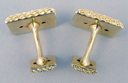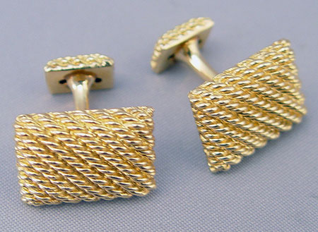 14K GOLD BASKET WEAVE CUFFLINKS: 14K yellow gold cufflinks in a basket weave design. Approx. .75'' x .5'' Weight: 19.4 grams.