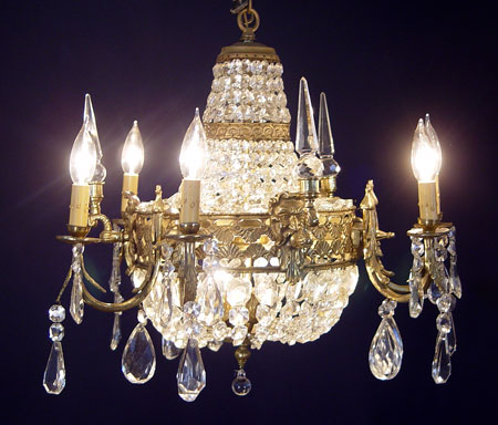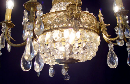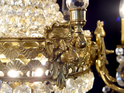 FRENCH BRONZE & CRYSTAL CHANDELIER: Masquerons and crystal prisms. The chandelier is 19'' tall, 23'' wide.