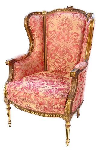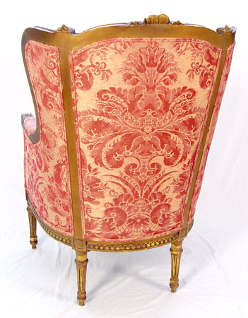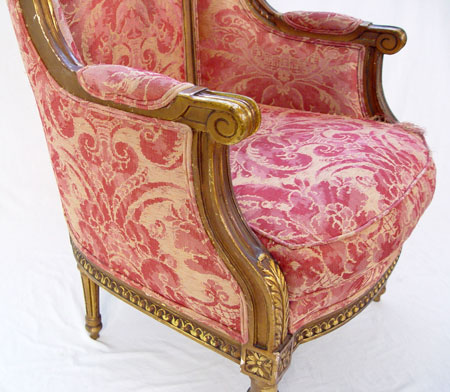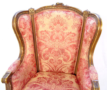 FRENCH LOUIS XVI STYLE WING BACK CHAIR: Carved gilt wood frame, slightly worn upholstery, 43'' x 27'' x 33''.