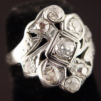 DIAMOND FILIGREE RING: 14K white gold ring with 9 old European round cut diamonds. Approx. .60 CTW. Rated SI1-I1 in clarity and J-K and Light brown in color. The diamonds are prong set. Weight: 3.3 grams. Size 4.25