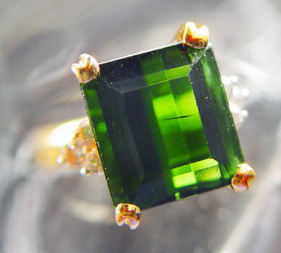 6.5 CT. TOURMALINE & .25 CTW DIAMOND RING: 14K yellow gold ring centering a large emerald cut 6.50 Ct. tourmaline. YG in Hue, 7 in Tone and 2-3 in Saturation. 6 round brilliant cut diamonds, .25 CTW, rated SI1 in clarity and H-I in color. The tourmaline and diamonds are prong set. Weight: 5.2 grams. Size 6.25