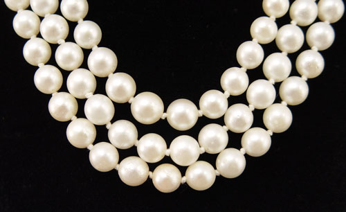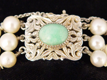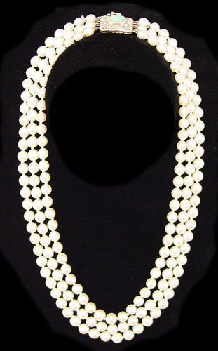 TRIPLE STRAND NECKLACE OF CULTURED PEARLS: 6.50 - 7.00 mm. Light cream in color with very slight rose overtone. Very Blemished with medium nacré, low to medium luster. Overall length is 18''. Rectangle shaped sterling silver filigree clasp with one oval shaped cabochon cut 10.00 x 8.00 mm unknown green stone. Clasp approx. 1'' x .562'' safety chain attached.