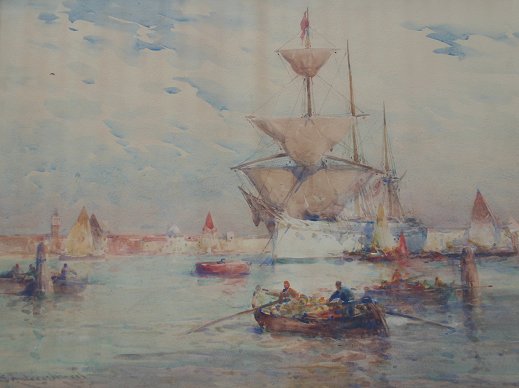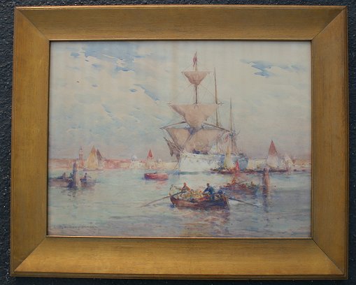 HUNT, Edmund Aubrey, (American, 1855-1922): The Grand Canal, Venice, Watercolor, sight size 20 1/4'' x 20 1/2'', signed, encased in period gilded oak wide frame with minor wear, 28 1/2'' x 36 1/2''. Vertical stain in center of image due to improper archival materials.