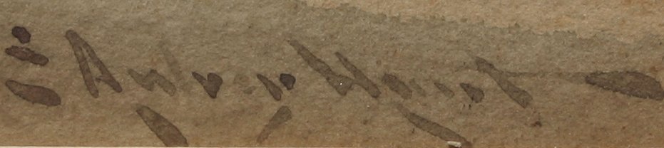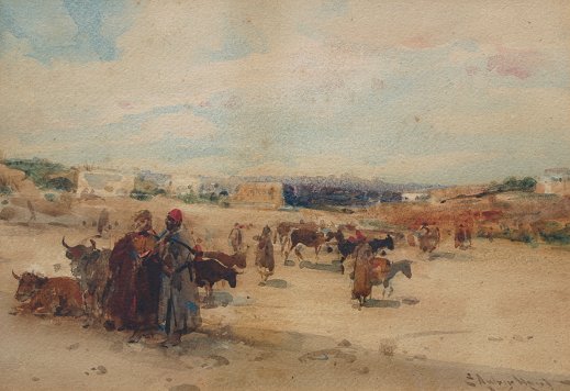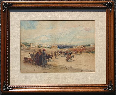 HUNT, Edmund Aubrey, (American, 1855-1922): Middle Eastern Village Landscape with Figures and Cattle, Watercolor, sight size 9 1/2'' x 13 1/4'', signed, later frame, 16 1/2'' x 20 1/2'', descended through the artist's family. Several scattered spots of foxing.