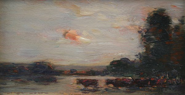 HUNT, Edmund Aubrey, Attributed, (American, 1855-1922): Cows Crossing Stream, Oil/Board, 2 1/2'' x 6'', period gilded frame with missing gesso in three corners, 4 1/2'' x 7 1/4'', no visible signature, from the estate of the descendants of EA Hunt.