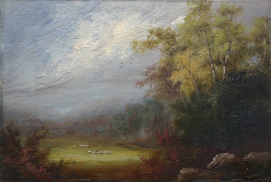 AMERICAN SCHOOL VALLEY LANDSCAPE WITH SHEEP, No. RUSSELL MASS: Oil/Board, 5 1/2'' x 8'', titled verso, monogrammed AMD?, unframed, from the estate of the descendants of EA Hunt.