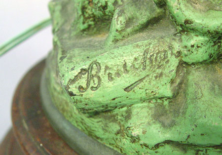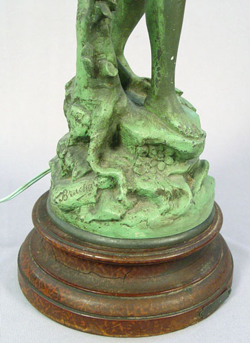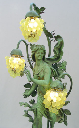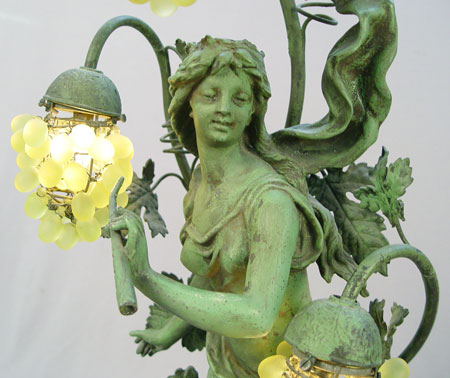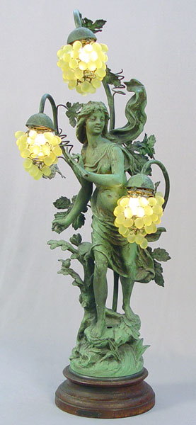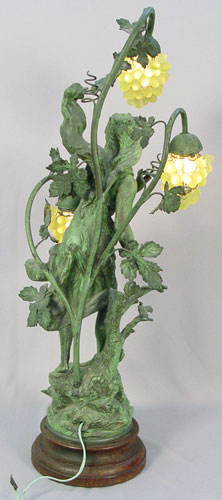 FRENCH FIGURAL LAMP: '' Le Chant du Rossigno'' after Bruchon. Patinated metal with glass grape cluster shades. Wood base. 35 1/4'' high.