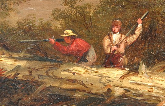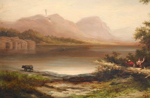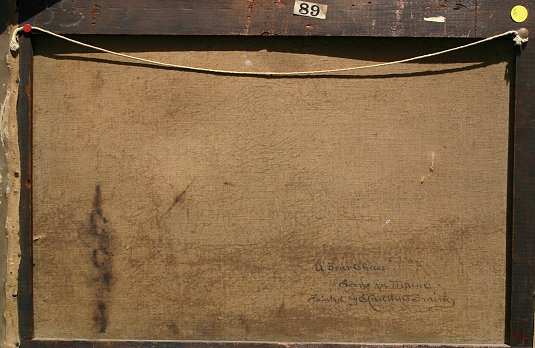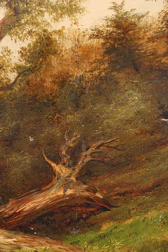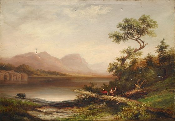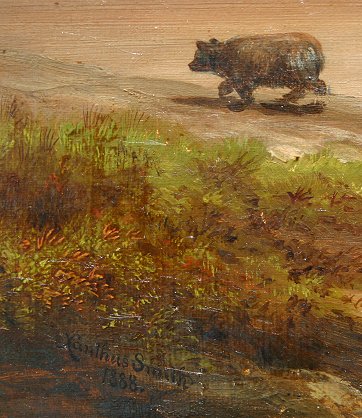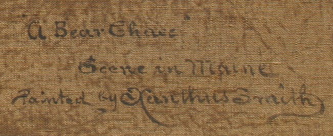 SMITH, Xanthus Russell, (America, 1839-1929): ''A Bear Chase'', Oil/Canvas, 15'' x 26'', signed and dated 1888, titled verso A Bear Chase Scene in Maine painted by Xanthus Smith, unframed. Several scattered tears, punctures and small flecks of paint loss, most notably in lower right quadrant, needs cleaning and restoration.