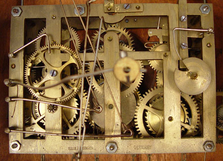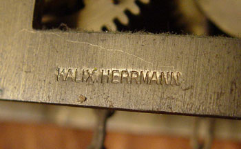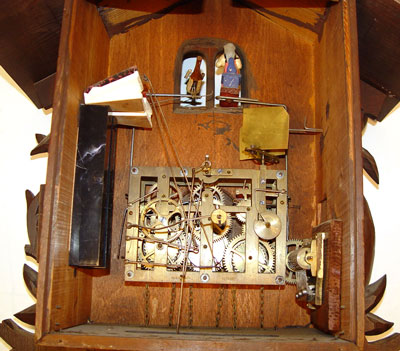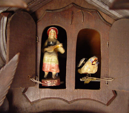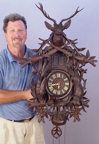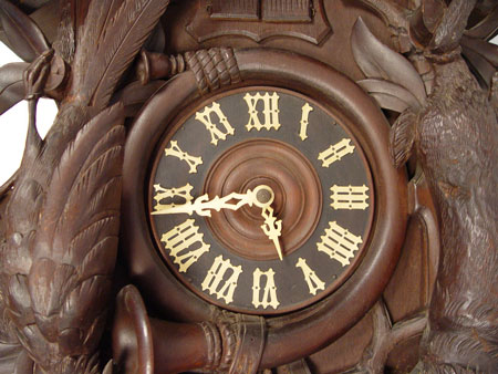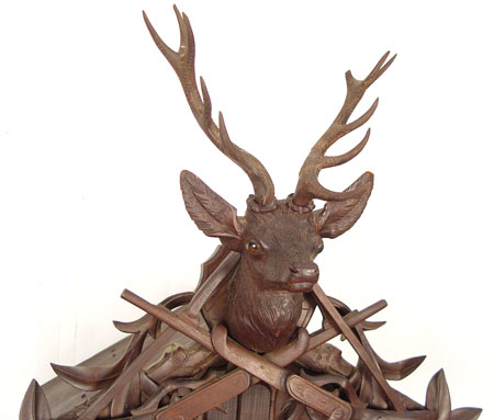BLACK FOREST GERMAN CUCKOO GAME CLOCK: Ornately hand carved with stag head and crossed rifles pediment. Pheasant, rabbit, horn and bag on body. Both rabbit and stag have glass eyes. 6 1/2'' wood face with roman numerals. Woman and bird exit the doors. Hand written paper tag written in German tacked to side. Weight driven with pine cone weights. Marked Kalix Herrmain Germany on works. Measures approx. 31'' high x 21 1/2'' wide x 16'' deep. Please note, stag head has one broken antler, repair to second antler, missing weights.