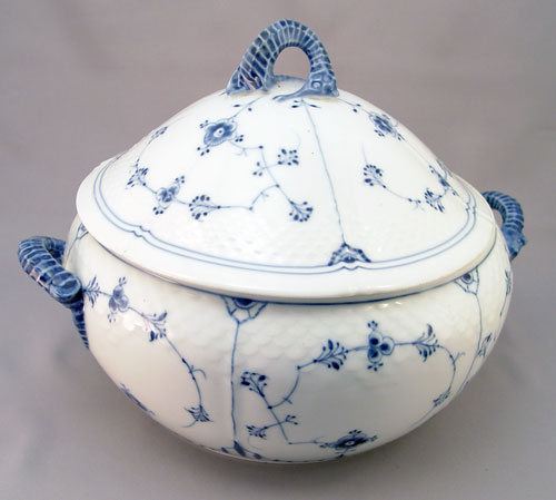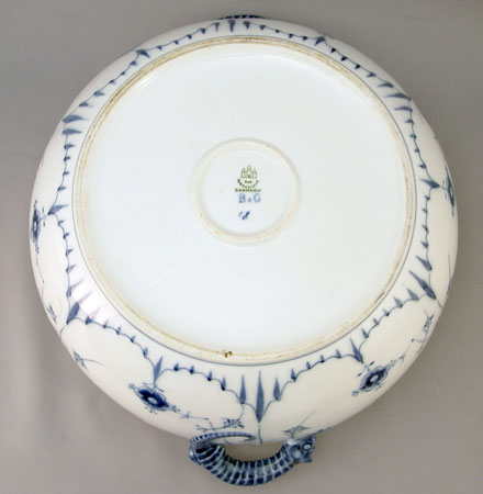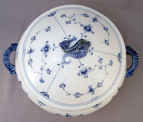 BING & GRONDAHL CLASSIC BLUE AND WHITE COVERED TUREEN WITH SEAHORSE HANDLES: Blue seahorse form handles and finial. 9''h., 13'' dia. overall.