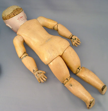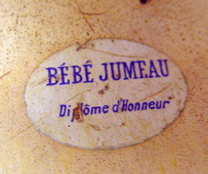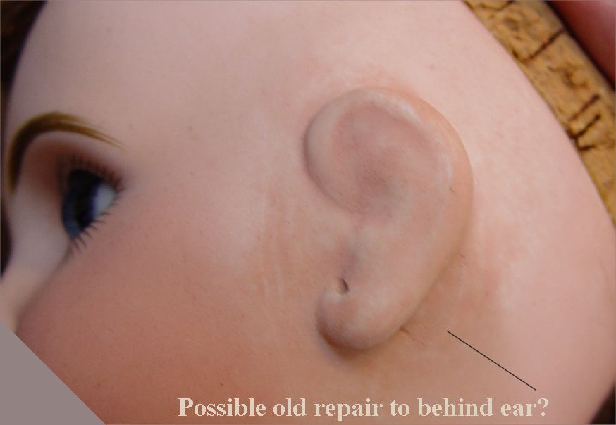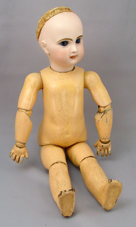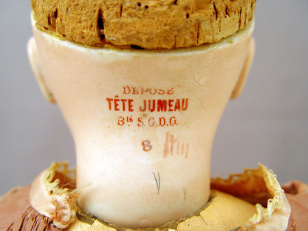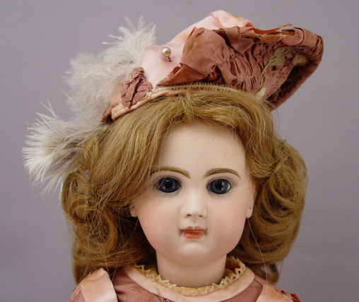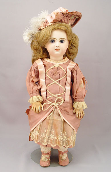 FRENCH TETE JUMEAU DOLL: Bisque head doll closed mouth, stationary blue glass eyes, pierced ears, painted features, curled blonde and cork pate. Signed in red on the neck ''Depose Tete Jumeau Bte S.G.D.E. 8''. The jointed body also has a Bebe Jumeau paper label. 18'' tall, completely dressed in pink and lace. Please note the outer pink fabric is worn, her hands have paint chips. Posible old repair behind left ear? Seemingly free of all other chips, cracks, or repairs.