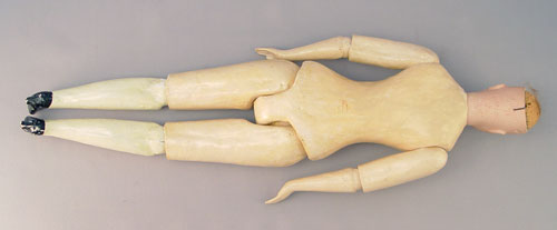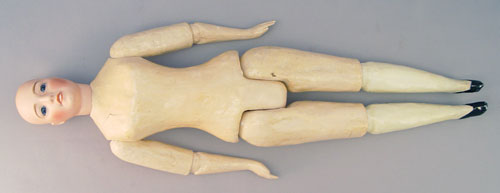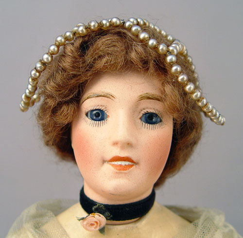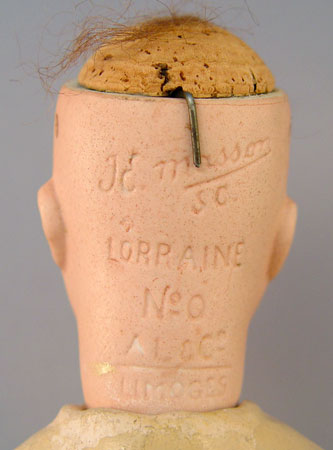 JE MASSON FRENCH DOLL CA. 1914-1916: Designed by Jules Edmund Masson, made in Limoges by Lanternier. Bisque head with stationary blue glass eyes, open mouth showing molded teeth, painted features, cork pate, brown wig, and beaded hair cap. The neck is impressed ''JE Masson/SC Lorraine No. 0 AL & Co Limoges''. Composition body with painted shoes. Original lace dress and hoop petticoat. Please note poor condition of silk under the tiered lace. 17'' tall.