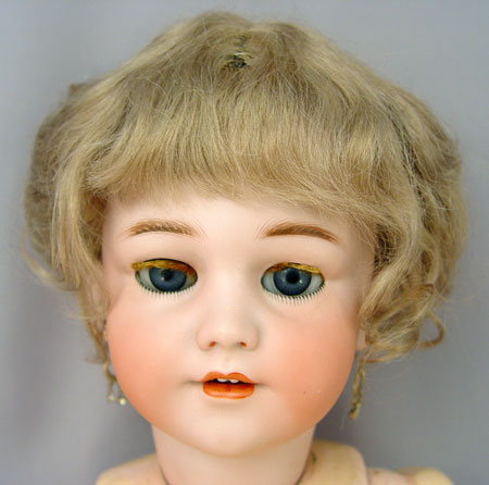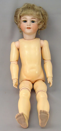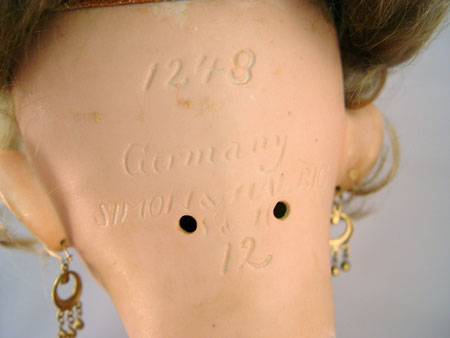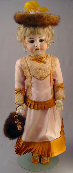SIMON & HALBIG GERMAN BISQUE HEAD DOLL: ''1248 Germany Simon & Halbig 12'' on the back of her neck. Bue glass sleepeyes, open mouth with teeth showing, earrings dangle from her pierced ears, upswept blonde wig. Fully jointed body in a lovely travel suit with pleated and lace trim, hoop skirt, and petticoat. Matching fur trimmed hat and fur muff. Shoes and stockings finish off the coordinating outfit. 25'' tall.
