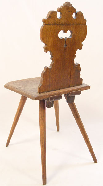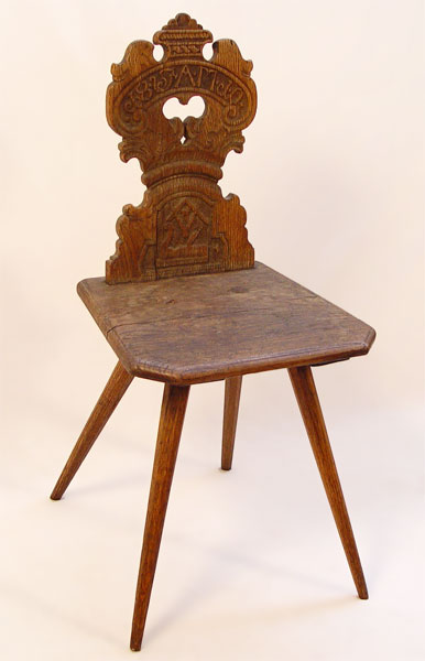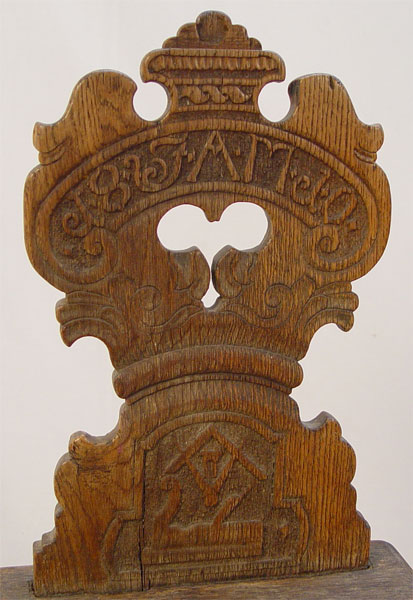 MASONIC HAND CARVED ARTIST'S CHAIR: Hand carved back with letters, numbers, swan and compass. From the descendants of Frank Schoonover, paper tag under seat The Sawhorse Studio Rockport, Mass. Measures 37 1/2'' high x 17 3/4'' wide x 18'' deep. Worn throughout, sold as is.