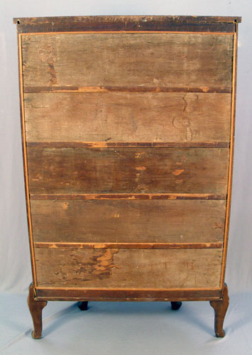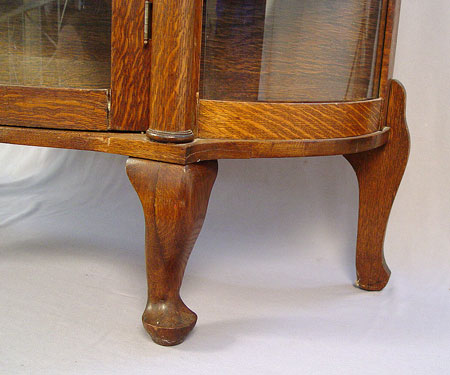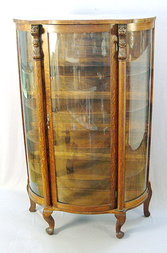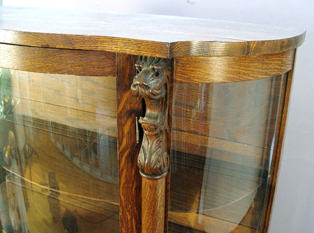 TURN OF THE CENTURY GRIFFEN HEAD TIGER OAK FRONT CHINA CABINET: 4 shelf interior. Triple bow front and sides. Carved griffin heads top the columnar stiles. Measures 62 1/4'' high x 38'' wide x 15'' deep. Please note space between glass and wood of cabinets left bowed side.