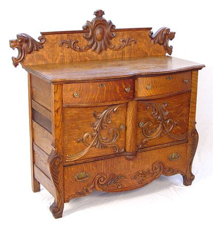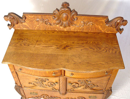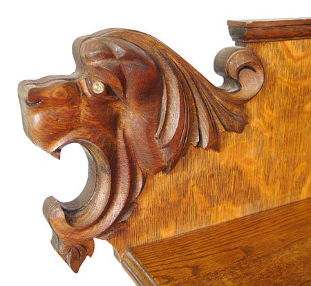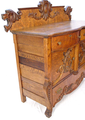 ROARING LION HEAD TIGER OAK SIDEBOARD: Glass eye lions flank the backsplash. 2 overhanging drawers with velvet lining, over 2 cabinet doors, over a full length drawer. 50'' high x 51'' wide x 22'' deep.