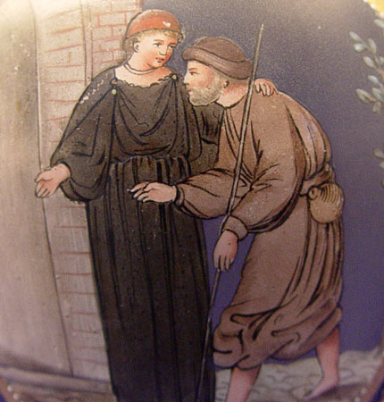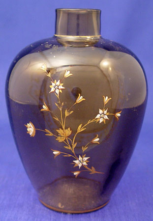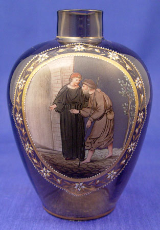 MOSER QUALITY ENAMELED ART GLASS VASE: A holy man welcoming the traveler image hand painted on brown glass, slight wear to the gold rim. 7 1/4''h.