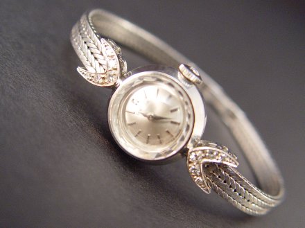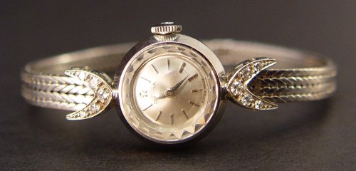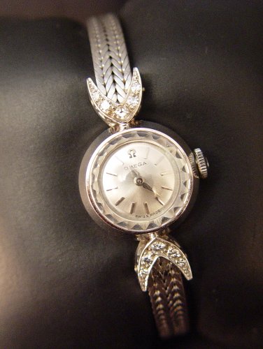LADIES 18K AND DIAMOND OMEGA WRISTWATCH: 18K white gold ladies Omega wristwatch. Round silver-tone dial with applied bar markers, glass crystal, jeweled movement. The watch is running but all watches are sold as is due to their delicate nature. Diamond lugs with ten round single cut diamonds. .25 CTW Approx., rated VS in clarity and G-H in color. Double foxtail bracelet with locking closure. 6.5'' Weight: 22.4 grams (including crystal and movement).