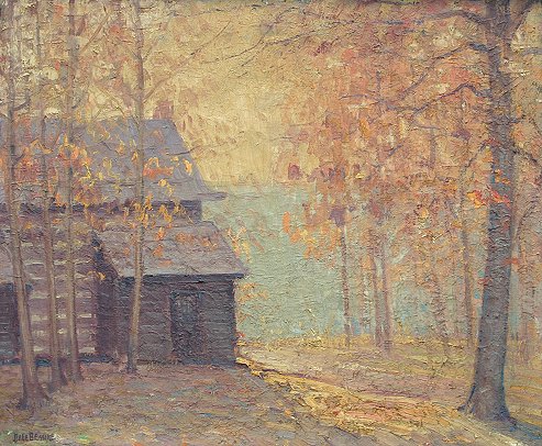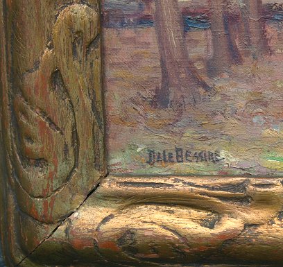 BESSIRE, Dale Phillip, (American, 1893-1974): ''Indian Summer'', Oil/Canvas, 20'' x 24'', signed, titled on stretcher verso, ''Indian Summer'', Dale Bessire Nashville, Indiana. Period gilded and carved frame with minor wear, 25'' x 29''. Cracklure in heavier area of paint application, if those are patches verso, they are pinpoint, and not obvious by blacklight. It looks like that stucco type patch material used for very small repairs.