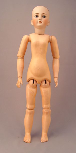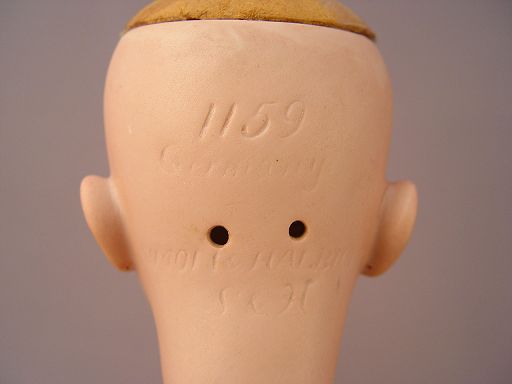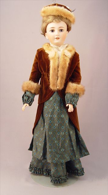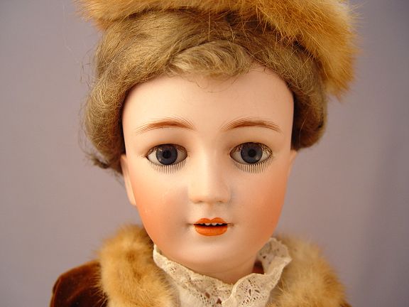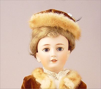 SIMON & HALBIG GERMAN BISQUE HEAD DOLL: ''1159 Germany Simon & Halbig'' on the back of her neck. Stationary blue eyes with lashes, open mouth showing teeth, pierced ears. Fully jointed body. Dressed for travel in a tiered skirt and white blouse, velvet jacket with fur trim and matching hat. 24'' tall.
