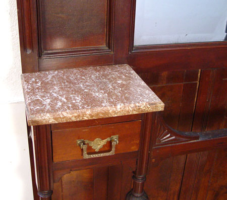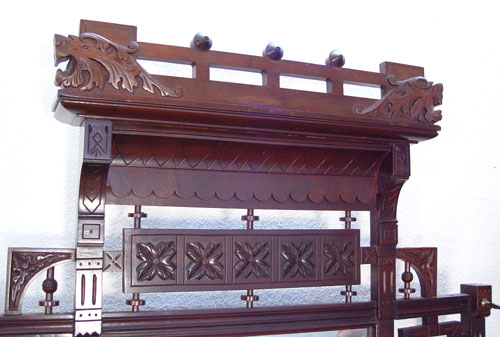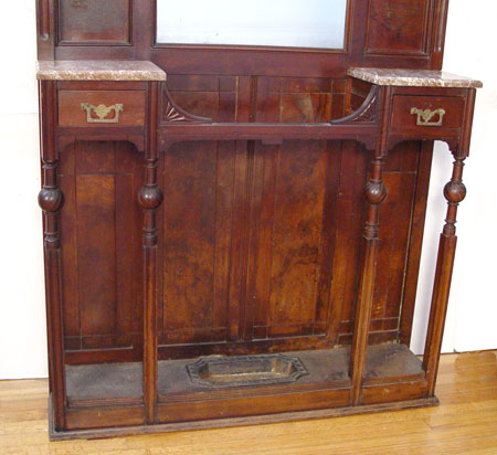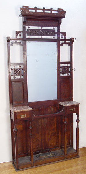 VICTORIAN MAHOGANY HALL STAND WITH MIRROR: All original with 6 hooks, beveled mirror, red marble over two drawers, and cast iron drip pan. Ornate gingerbread and lion head carved crest. 7'10'' high x 41 1/2'' x 10''.